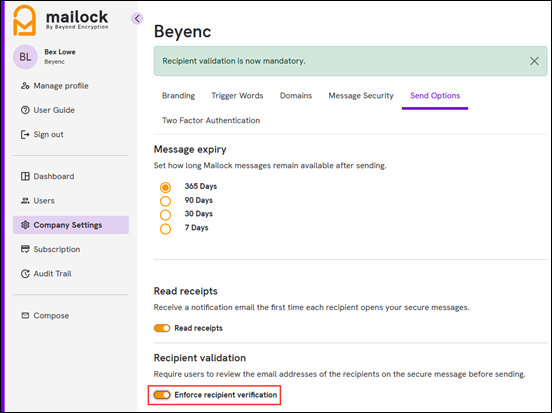 The Company Admin portal provides a feature to switch on recipient validation.