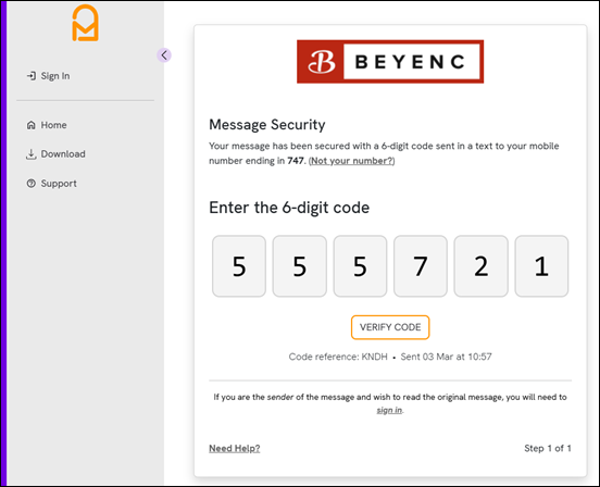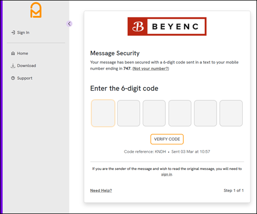 If you’ve received a secure message, clicked on ‘Read my message’ and are taken to a screen like the one below then you'll need to check your mobile for a text message with a 6 digit code: